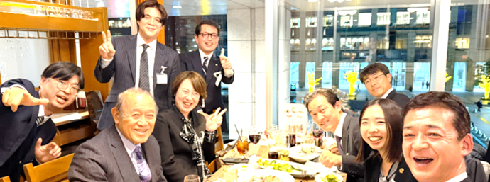 懇親会後、少人数で開催した塾長を囲む放談会では、特別なゲストもご参加くださり、ゲスト・塾生の交流を行いました。さらに、塾長の傘寿のお祝いで塾生からプレゼントとして名入りの杖が贈られました。