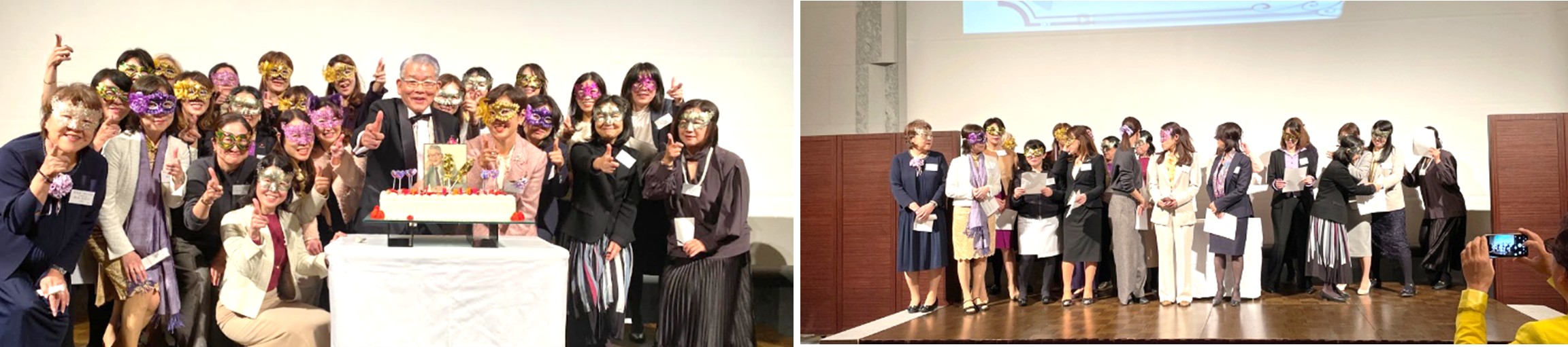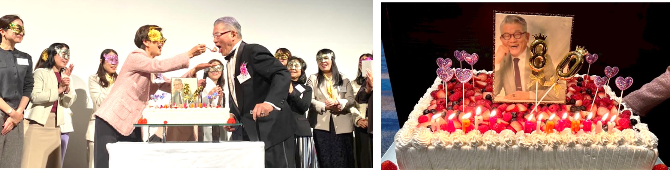 その後、最初の余興としてサプライズ企画が披露されました。 まず、一柳塾長の似顔絵が描かれた特製バースデーケーキが仮面をつけた淑女たちと登場し、会場から大きな歓声が上がりました。顧問の白石先生から一柳塾長へのファーストバイトも行われ、温かくユーモアあふれるひと幕となりました。