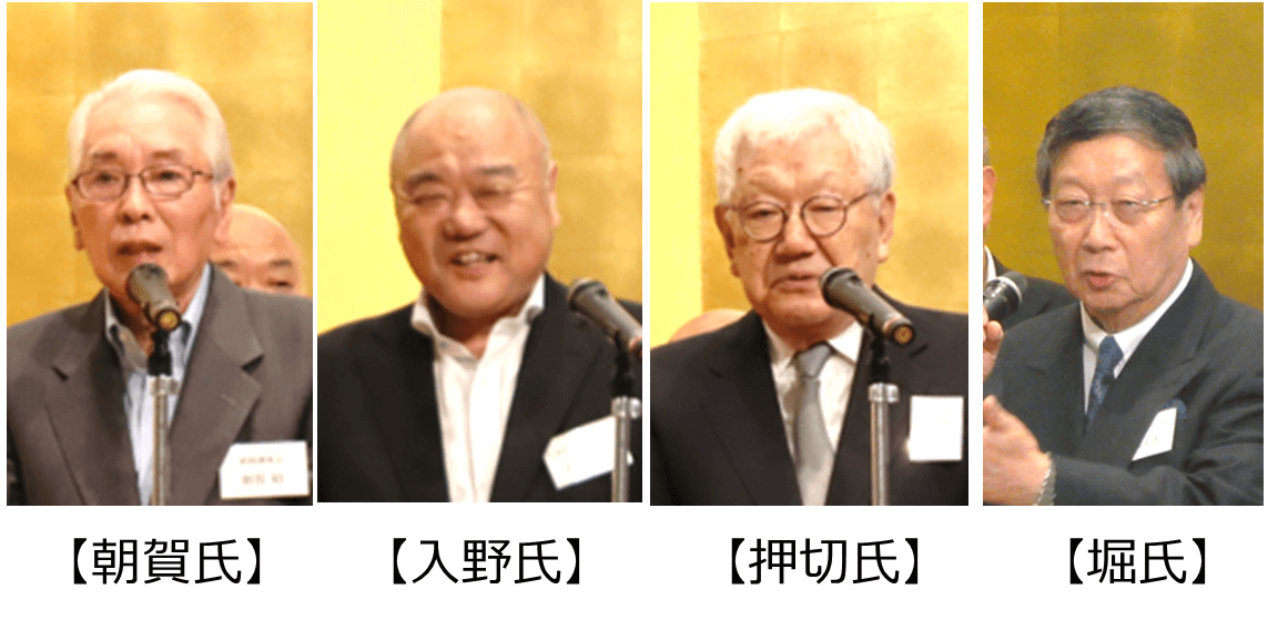 第2組目(官僚時代の友人)は、田中角栄先生の秘書で50年来の付き合いの政経調査会会長・朝賀様、通産省の後輩で日本自動車輸入組合副理事長兼専務理事・入野様、役人時代の同期の城山綜合法律事務所代表社員弁護士・押切様、コンサルタントの師匠で元ベインアンドカンパニー日本代表・堀様がご登壇されました。朝賀様は、官僚時代の一柳の意地悪なエピソードを交えながら「一柳さんが本当にすごい人なのか、いまだに謎が解けていない。」、入野様は「人の軽口は言うが、恨まれない。ミスターイノベーションとして、失敗してもどんどん進んでいく。」、押切様は「自分の属する組織よりも国益を最も大事にする。信頼できる男。」、堀様は「いろいろアドバイスもしたが、最終的には自分の考えでどうすれば社会に貢献できるかを考えている。その結果が今の形になったのは素晴らしい。」とのお言葉をいただき、官僚時代からのブレない志が明らかになりました。
