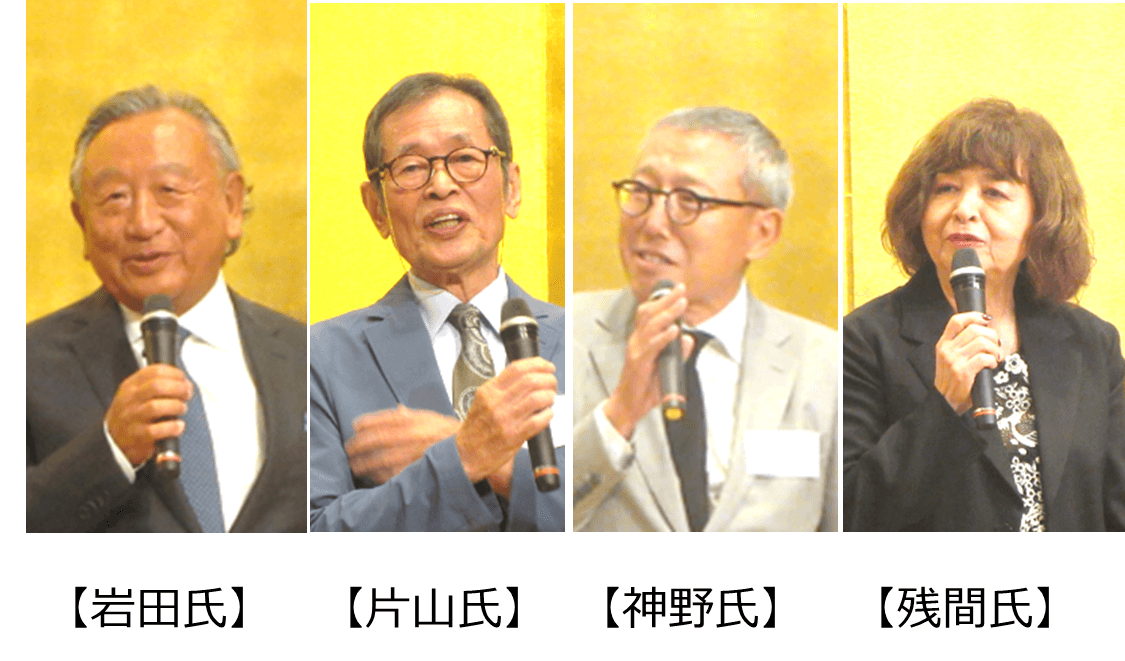 第3組目(起業後を知る人々)は、フォース・マーケティングアンドマネージメント代表取締役社長CEO・岩田様、ケイオフィス代表取締役・片山様、サーラコーポレーション代表取締役社長兼グループ代表CEO・神野様、キャンディッドプロデュース代表取締役社長・残間様がご登壇されました。岩田様は、「当時は商売の能力は全くなかったと思うが、現在こうなっているのは商才がある証拠。私も、会社のカタログ誤りで困ったときに一柳さんに助けて頂いた。」、片山様は「岩崎さんから『一柳をひとりの人間として書いてほしい』という助言もあり、良い本に仕上げられました。」、神野様は、自身の会社の監査役を依頼したエピソードを交え「塾については、一柳さんから相談を受けて頼まれて一流塾に入った。」、残間様は「TV番組は、一柳さんが偉そうじゃないから最初から続くと思ってた。素晴らしいスポンサーがいらっしゃるも一柳さんの信頼の証。」とのお言葉をいただき、長年の信頼関係の深さを感じました。