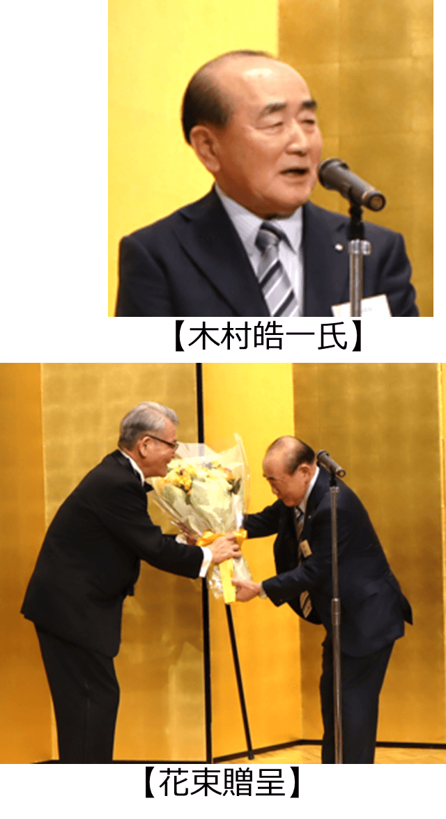 時が経つのを忘れてしまうほどの盛り上がりの中、ミキハウスグループの代表取締役社長木村晧一様から中締めの挨拶を頂きました。木村様は、一流塾やテレビ番組へのこれまでの関わり合いを示し、ユーモアも交えながら、「私は30代で一柳さんと出会った。当時役人だった一柳さんは『世界中の人が誇れる日本を作りたい。』と言っており、スケールの大きさを感じた。関係される皆様のご活躍とご健勝を祈念します。」とのお言葉をいただき、木村様から一柳への花束贈呈ではこの日最大の拍手に包まれました。一柳からは、「男は心、一柳の志。」と締めの言葉を頂きました。
