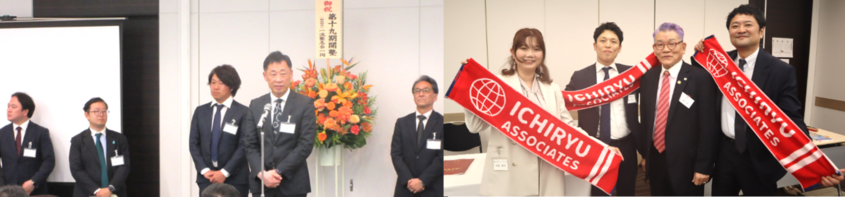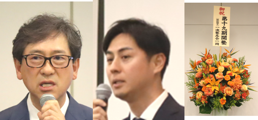 続いて懇親会からご参加頂いた八木氏からご挨拶いただいた後、一流塾卒塾生の組織「一流塾志会」から会長の中井正幸氏(中井エンジニアリング㈱ 代表取締役社長 一流塾第4期生)と副会長の森岡健太郎氏(㈱ウブン 代表取締役社長 一流塾第12期生)にもご参加頂き、一流塾の素晴らしさを存分に語って頂き、第19期生にエールを送られました。